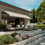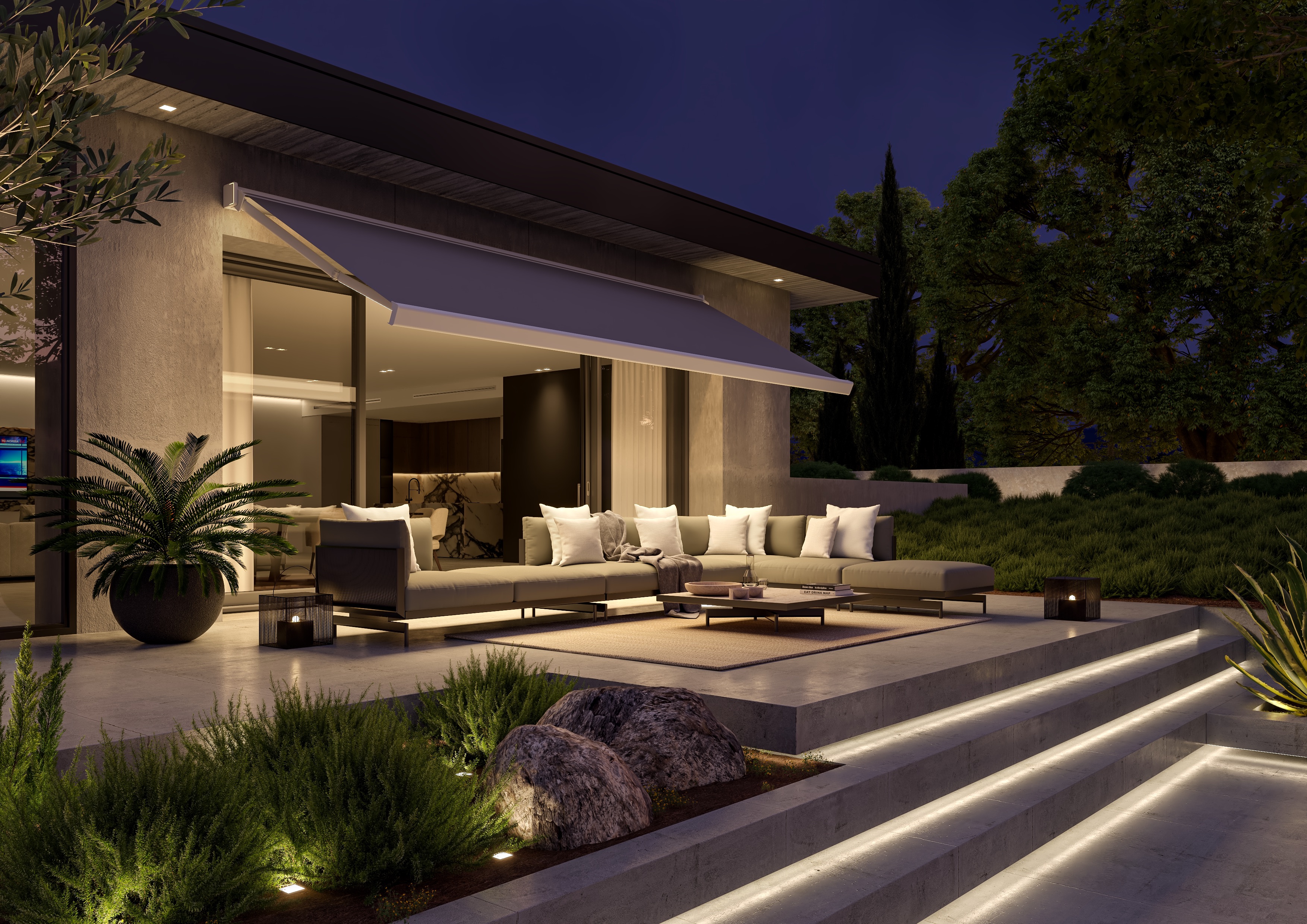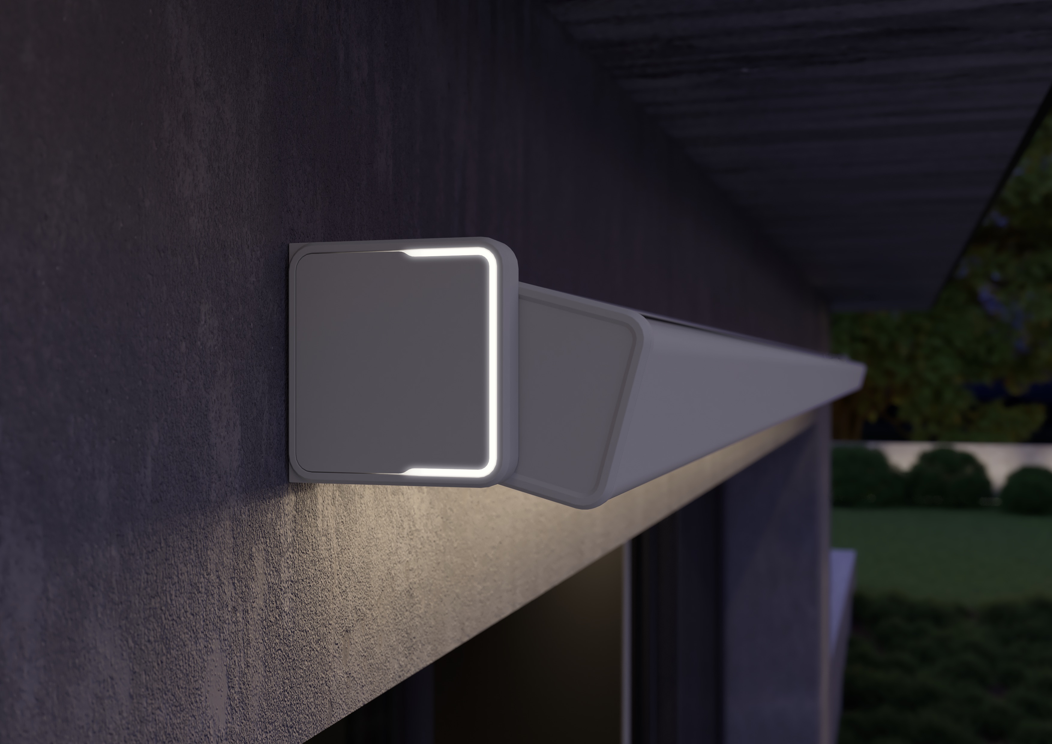 BASE Q MAX is a full cassette folding arms awning on two side brackets and wall accroaching brackets with an anchoring back plate, Balteus or Spin arms. The squared design of the cassette is intended to integrate with the modern, linear aesthetics of contemporary architecture. The cassette is inspectable. The brackets allow the awning to be installed either on a wall or ceiling, and the adjustment can be performed in a single operation thanks to the through-screw system. The product can be completed with the optional light kit on the cassette and supports. All components are made of painted aluminium, ensuring aesthetic appeal and durability.