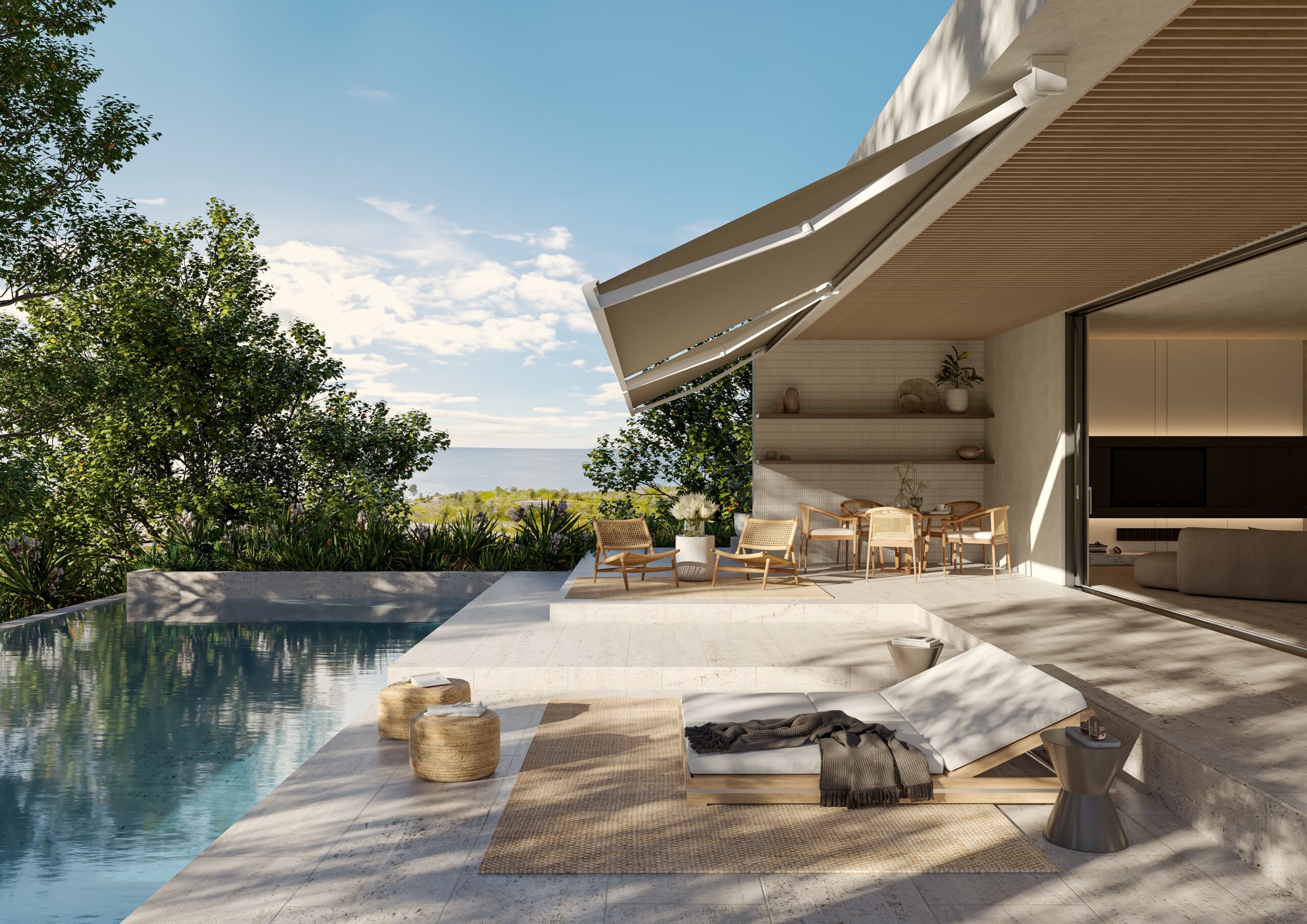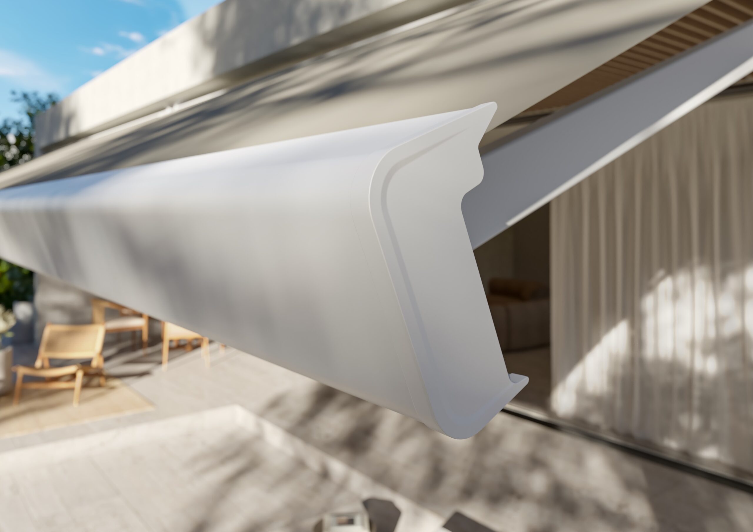 L’assenza di viti ed elementi a vista e gli ingombri ridotti rendono la tenda ideale per contesti architettonici di ultima generazione, mentre tutti i componenti in alluminio verniciato garantiscono durabilità e resa estetica nel tempo.